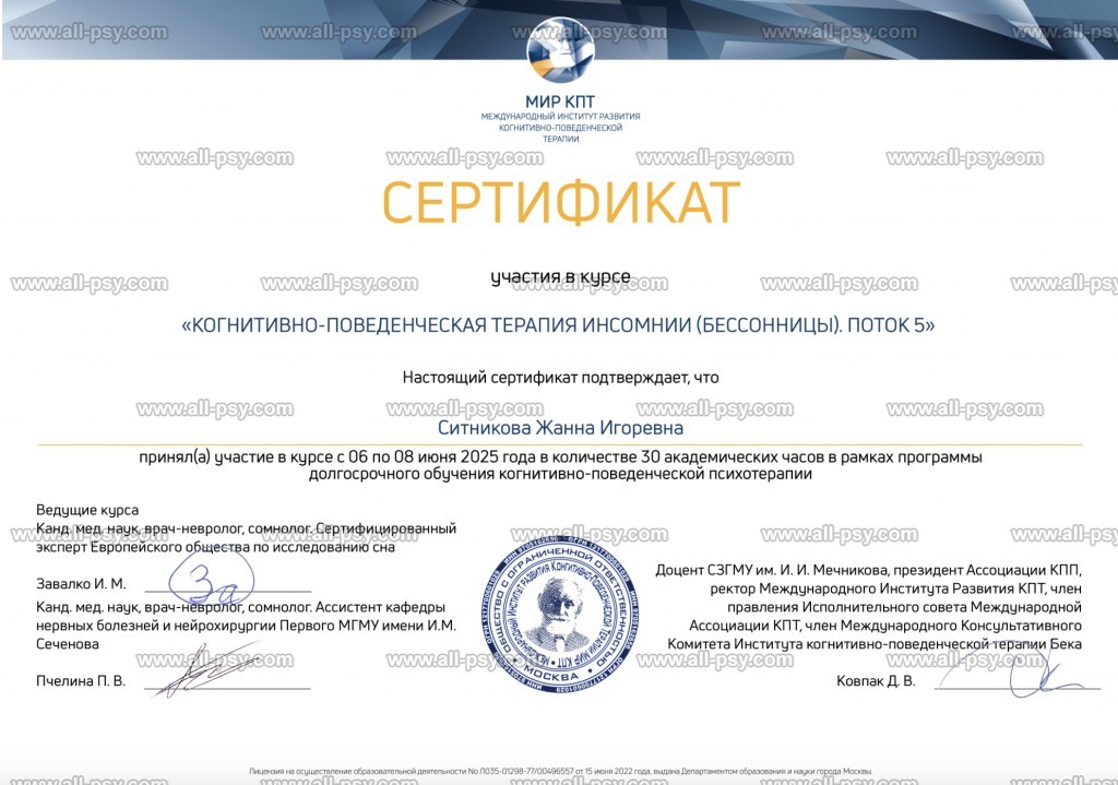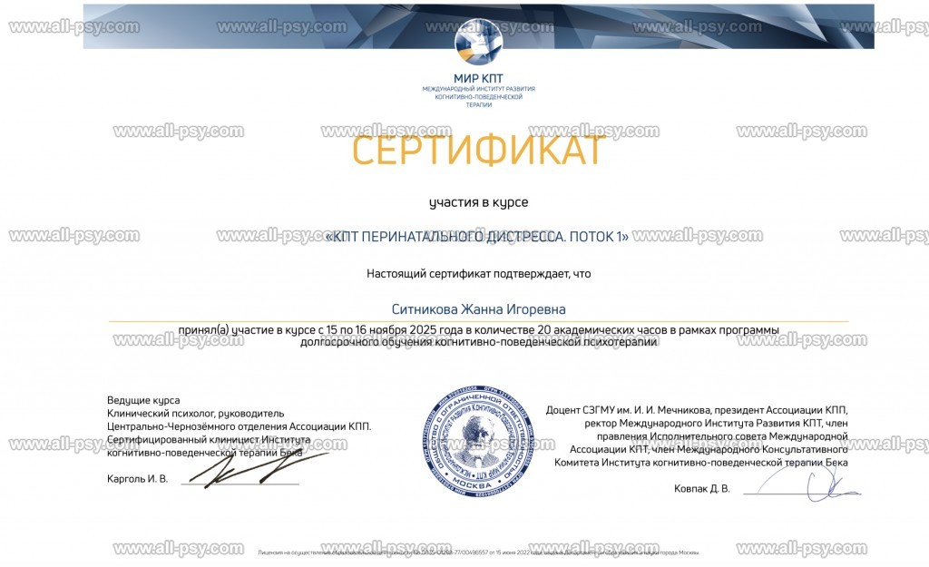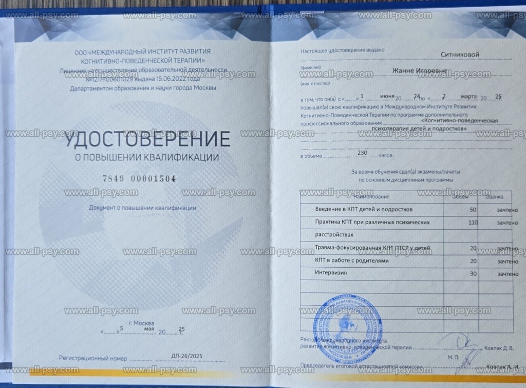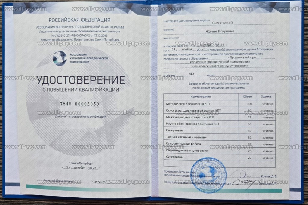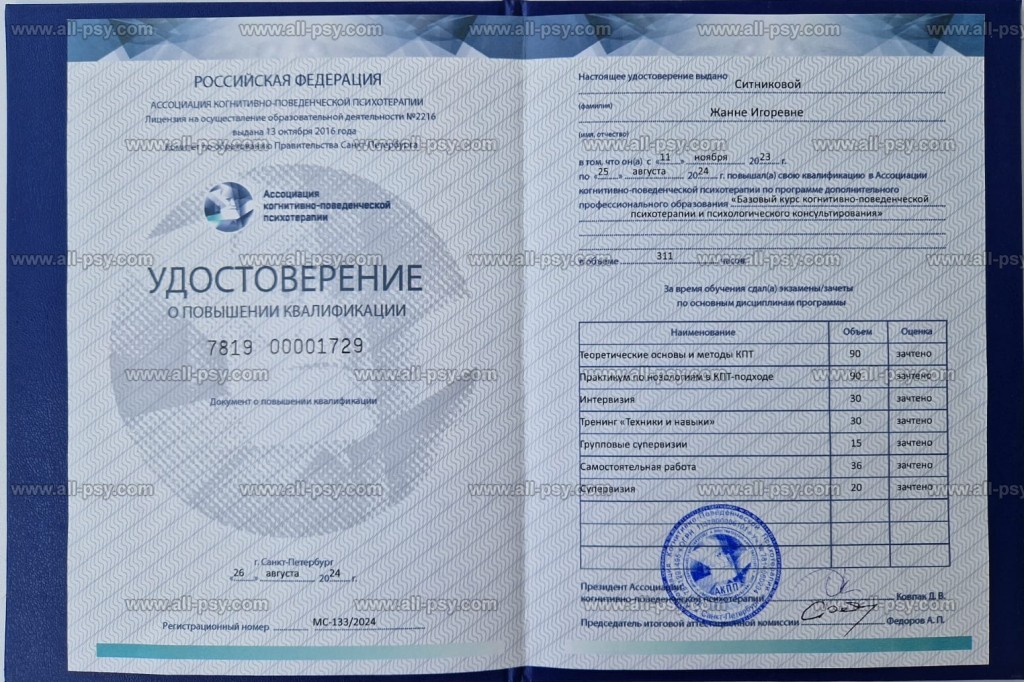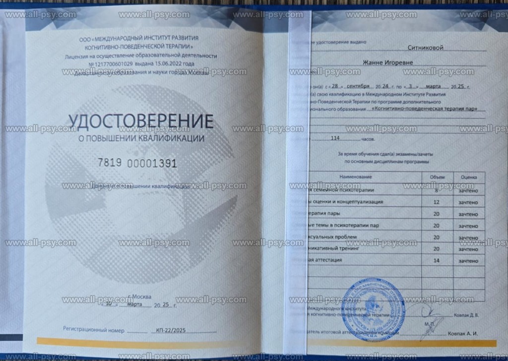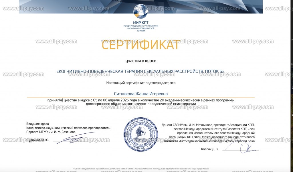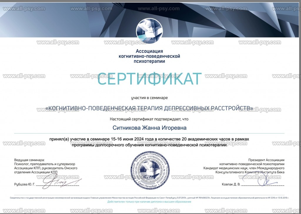 Когнитивно поведенческий терапевт, член Ассоциации когнитивно-поведенческой терапии (АКПП), сертифицированный специалист Института Бека (Beck institute of CBT. USA). Также повышала квалификацию в следующих подходах : Схема-терапия, Терапия принятия и ответственности, терапия сфокусированная на сострадании, КПТ пар и семей, КПТ детей и подростков, КПТ РПП, КПТ ПТСР и КПТСР.