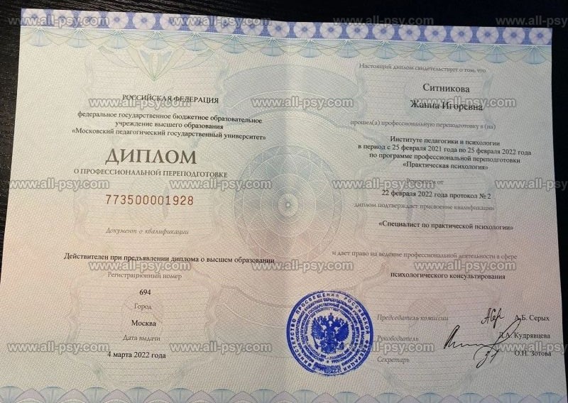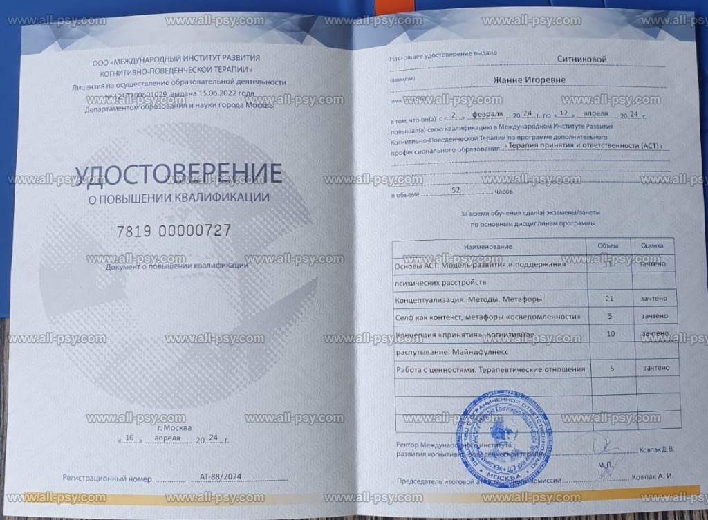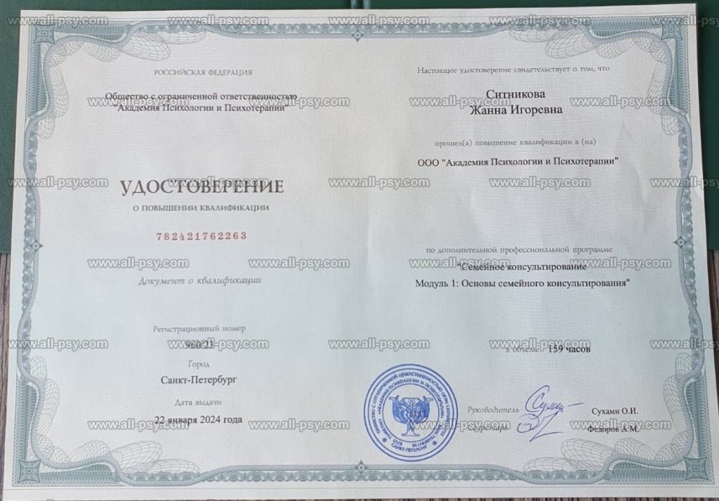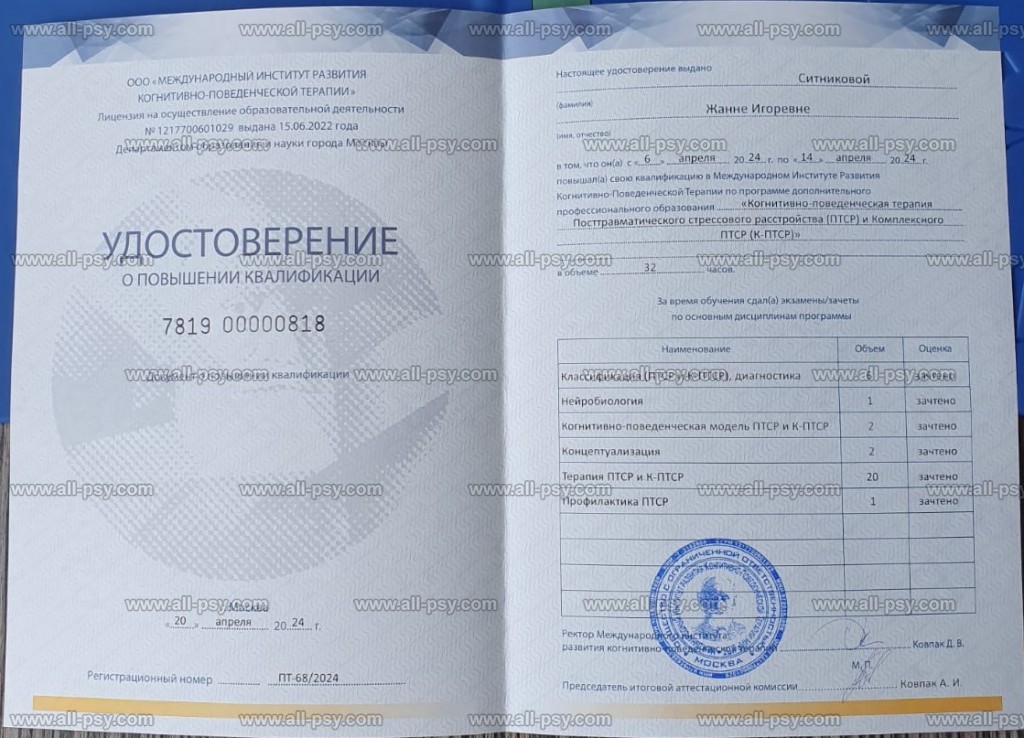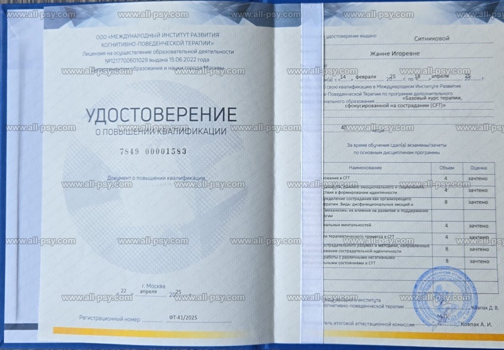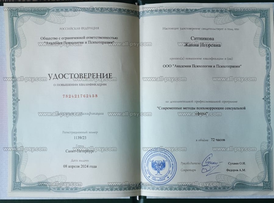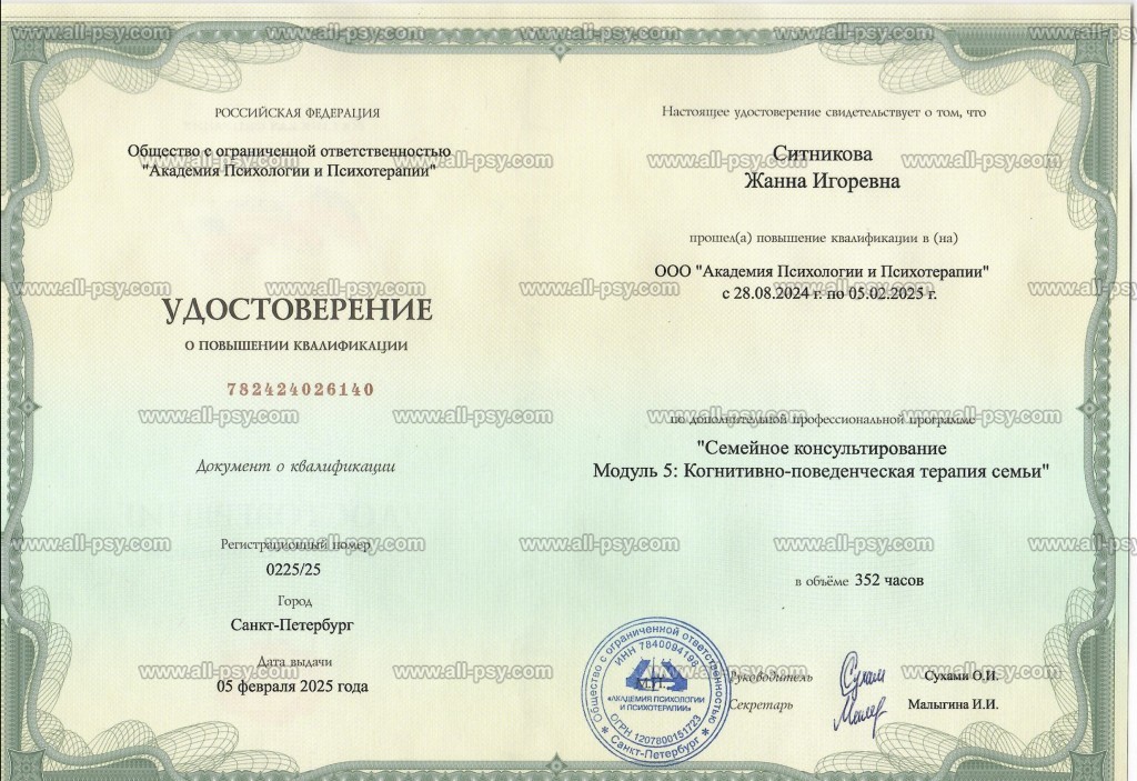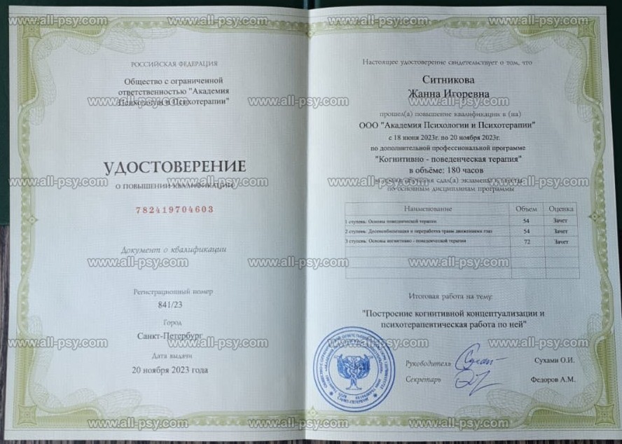 Когнитивно поведенческий терапевт, член Ассоциации когнитивно-поведенческой терапии (АКПП), сертифицированный специалист Института Бека (Beck institute of CBT. USA). Также повышала квалификацию в следующих подходах : Схема-терапия, Терапия принятия и ответственности, терапия сфокусированная на сострадании, КПТ пар и семей, КПТ детей и подростков, КПТ РПП, КПТ ПТСР и КПТСР.
