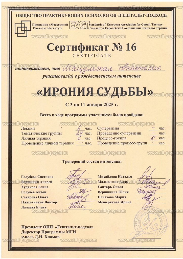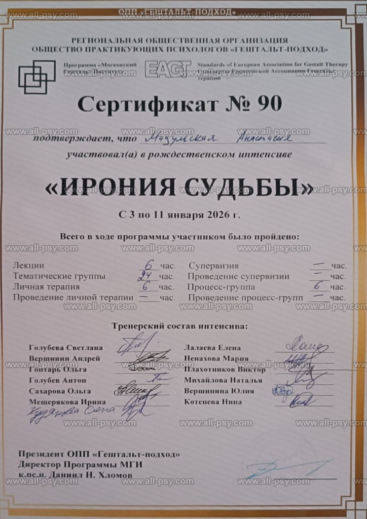 Я сама прохожу личную терапию, учусь на 2-й ступени гештальт-терапии, регулярно участвую в супервизионных и терапевтических группах.