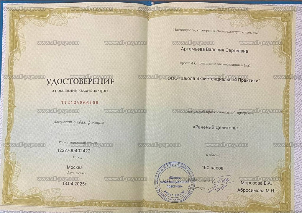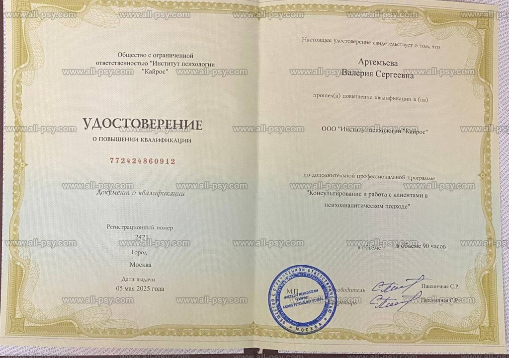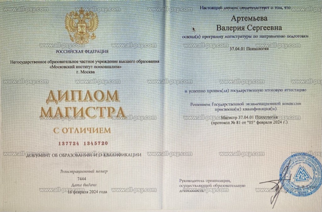 — Московский институт психоанализа — магистр психологии (диплом с отличием)
