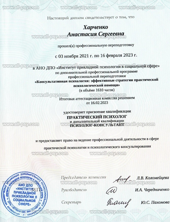 У меня три образования: техническое, филологическое и психологическое. Как технарь я привношу чёткость и ясность в консультацию, как филологу мне более глубоко раскрывается смысл слов, которыми Вы описываете свою проблему и переживания, как психолог я предлагаю Вам по-новому взглянуть на проблему и найти пути решения с бОльшей ясностью и глубиной.