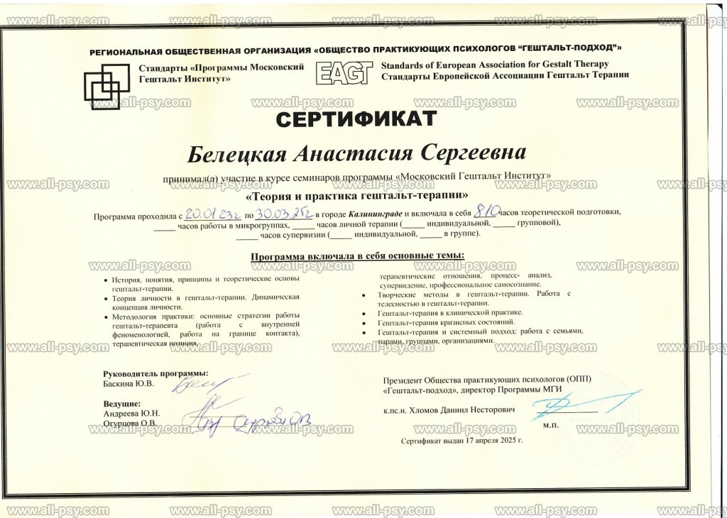 В работе я использую классический метод гештальт-терапии. Дополняю его техниками НЛП, коучинга, расстановочных упражнений по Б.Хеллингеру для лучшего эффекта. Такая терапия подходит как для краткосрочных целей - 3-10 сессий, так и для глубинной проработки.