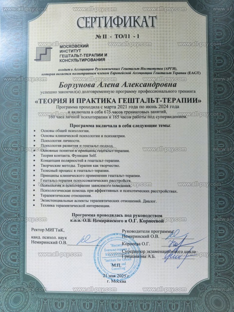 Сама прохожу регулярную личную терапию (более 6 лет) и супервизии, считаю это необходимым условием для качественной работы с каждым клиентом.