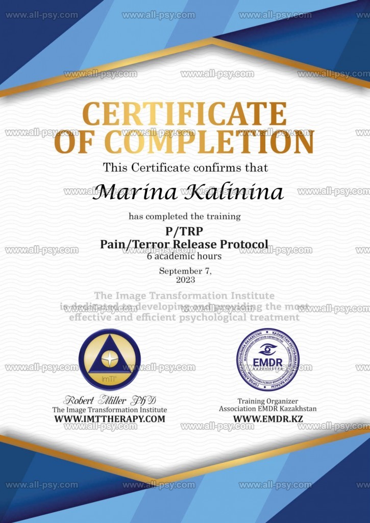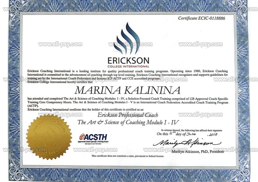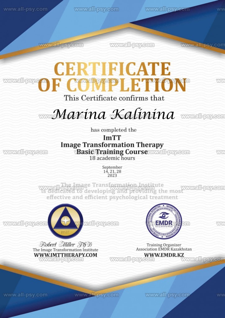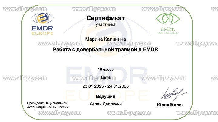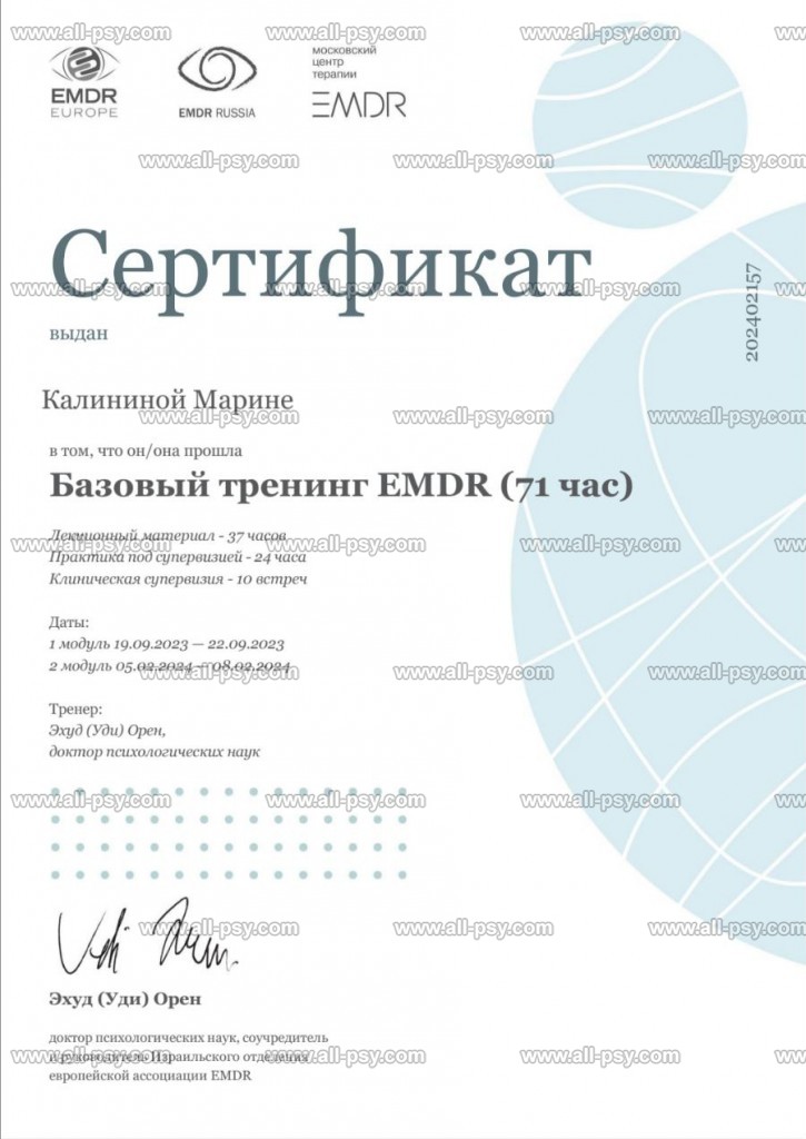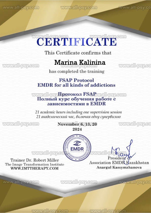 EMDR(ДПДГ)-терапевт, КПТ-терапевт и сертифицированный коуч ICF.