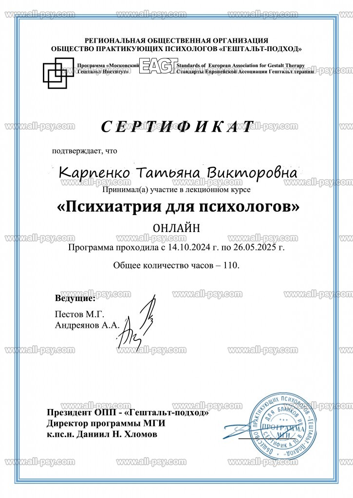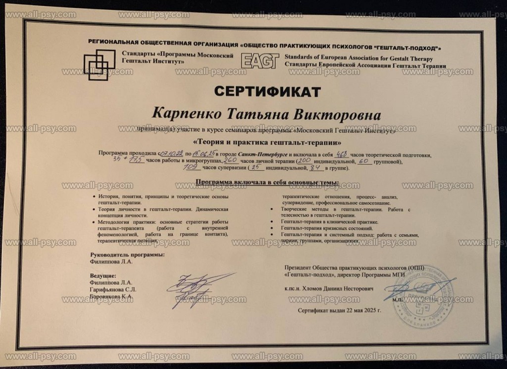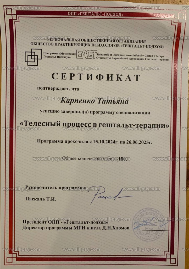 Одной из опор меня как терапевта и просто человека стала специализация «Телесный процесс в гештальт-терапии», поэтому если у вас нарушена телесная чувствительность или есть психосоматические симптомы, или вы часто зажаты, напряжены, то я могу помочь с этим.