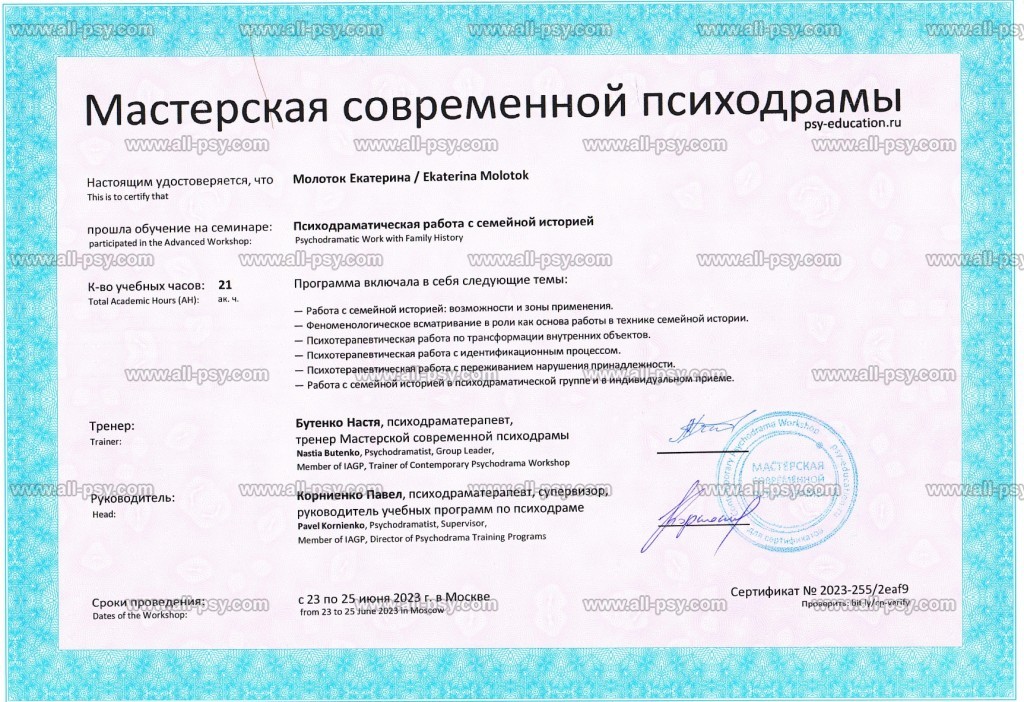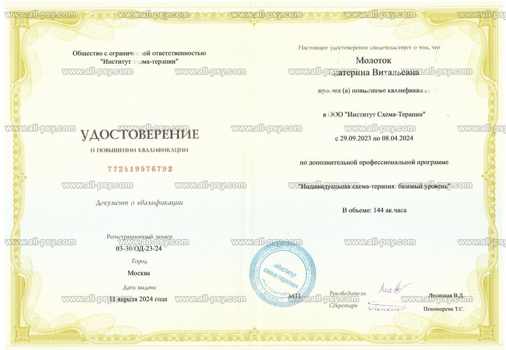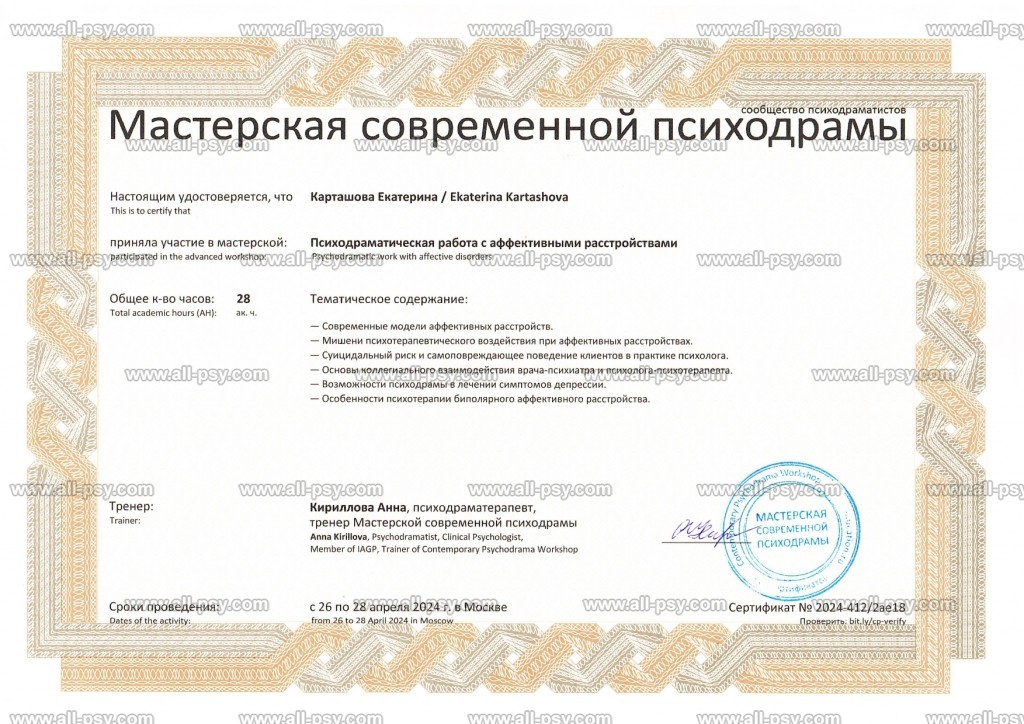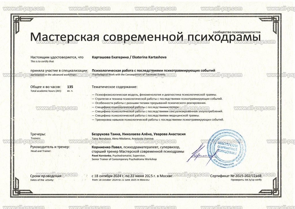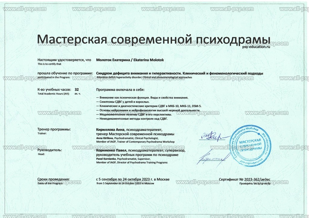 Также училась схема-терапии и КПТ, но мой основной подход - феноменология и психодрама. Тем не менее, я могу интегрировать инструменты из перечисленных подходов в свою работу при необходимости.