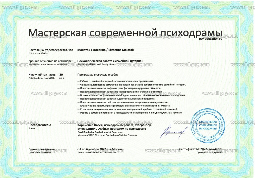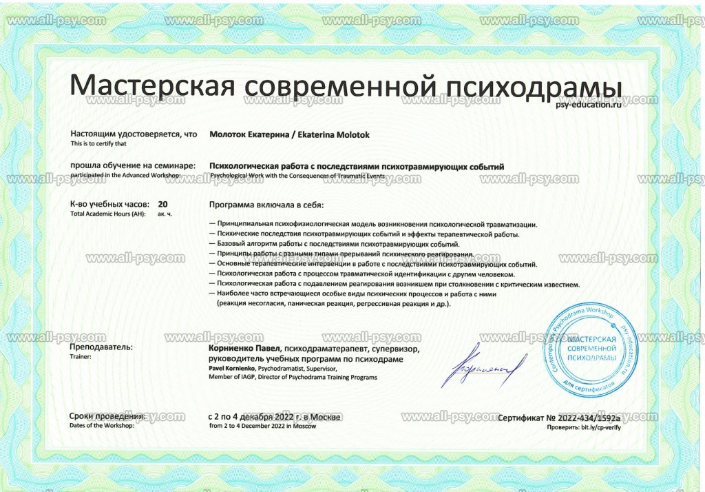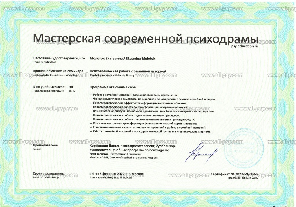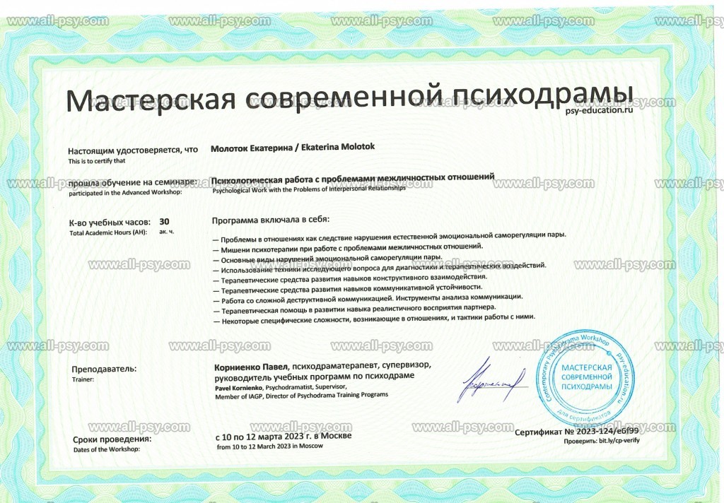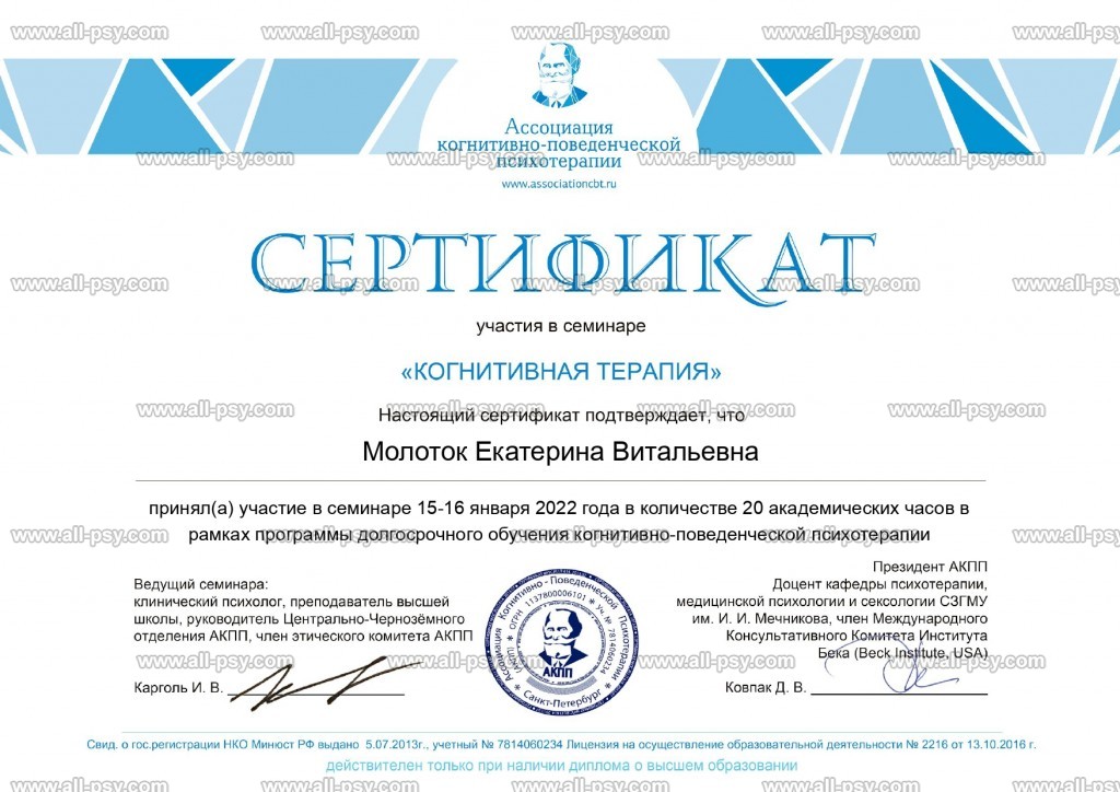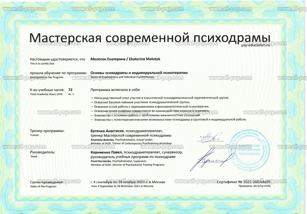 Также училась схема-терапии и КПТ, но мой основной подход - феноменология и психодрама. Тем не менее, я могу интегрировать инструменты из перечисленных подходов в свою работу при необходимости.
