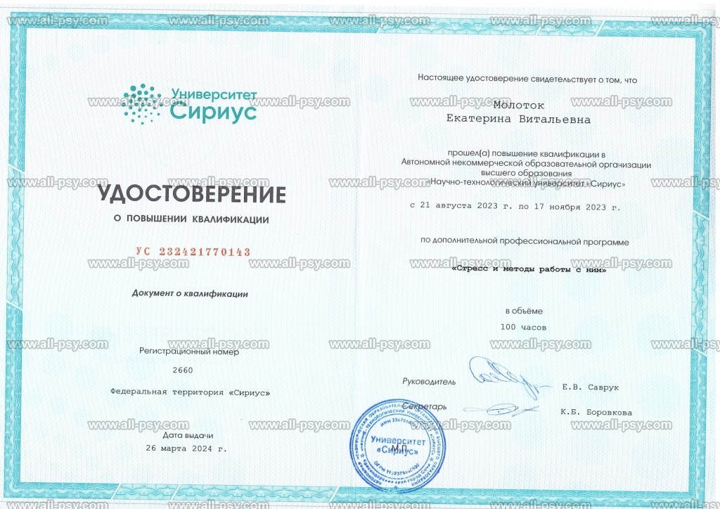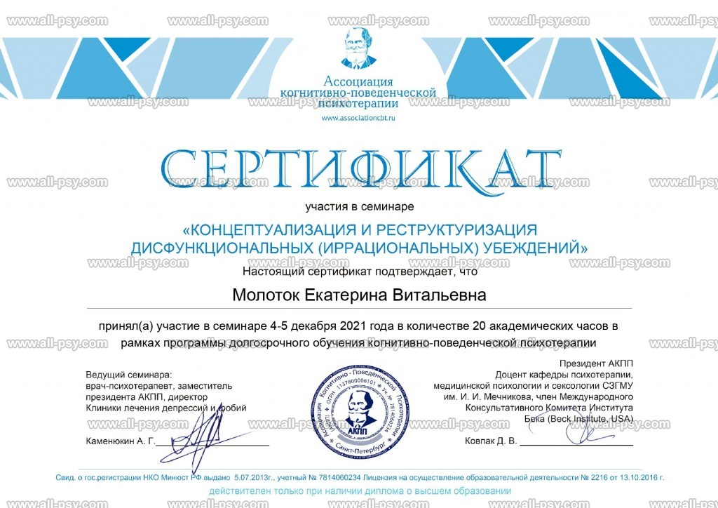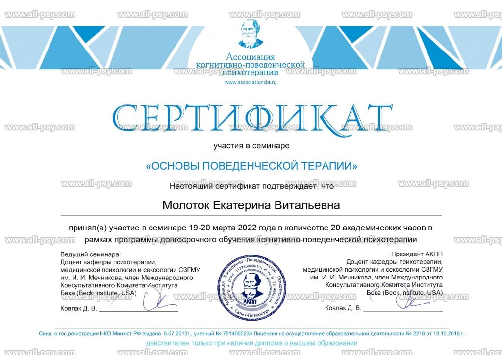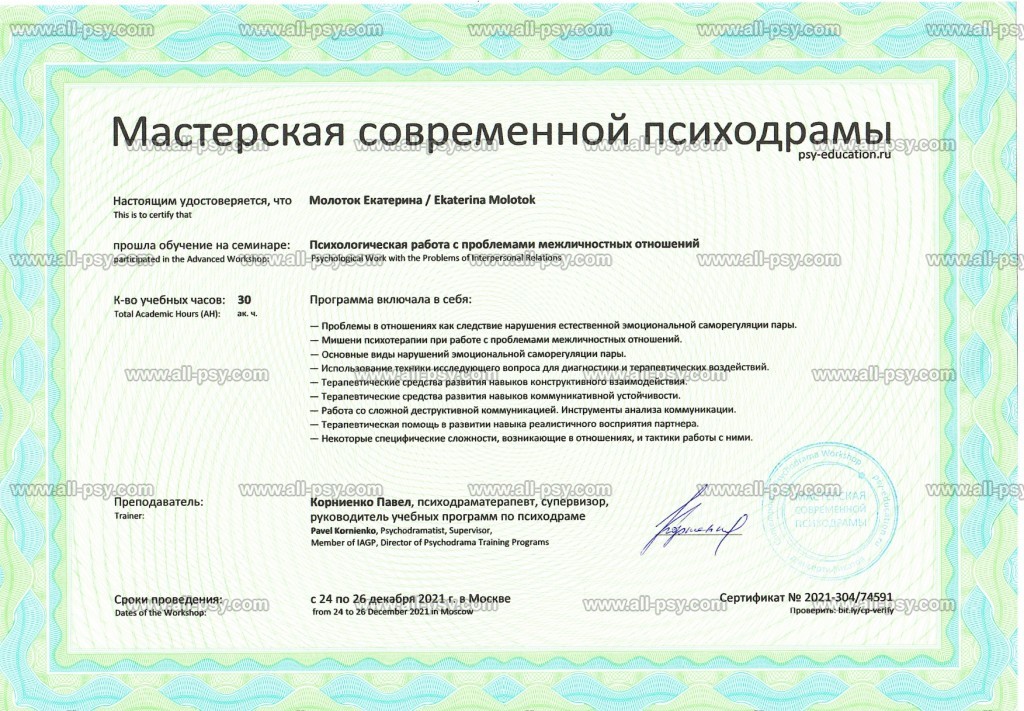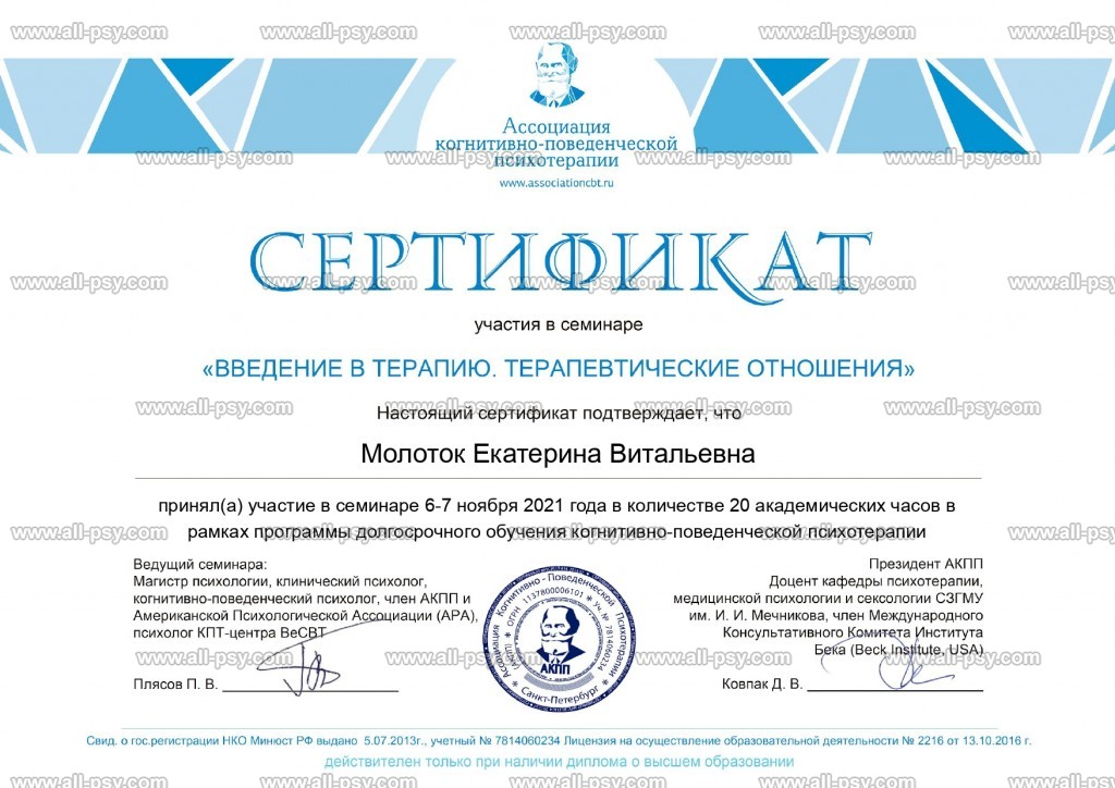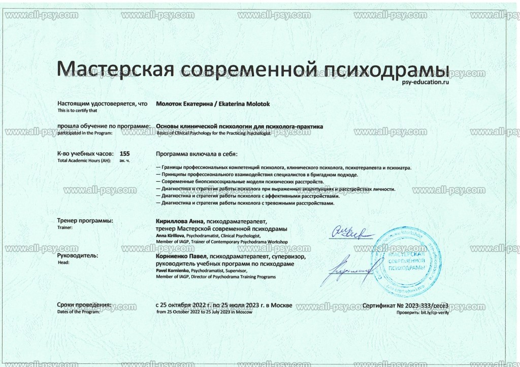Клиническое образование позволяет мне принимать клиентов с психиатрическими диагнозами: аффективные расстройства, тревожные расстройства, расстройства личности, СДВГ, ПТСР и кПТСР. На данный момент не работаю с РПП и зависимостями.