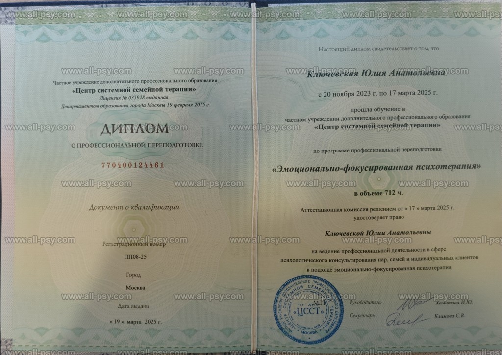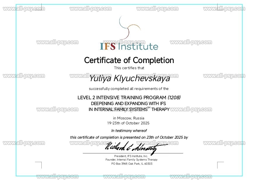 В основном работаю в подходе IFS ( Терапия внутренних семейных систем), обучалась этому методу в IFS institute ( США) и имею Level 2 .