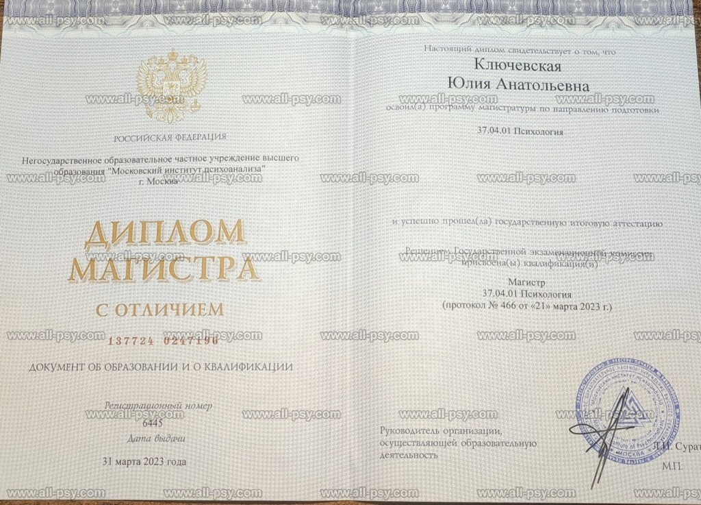 Окончила специалитет в 2002 году, магистратуру с отличием в 2023.