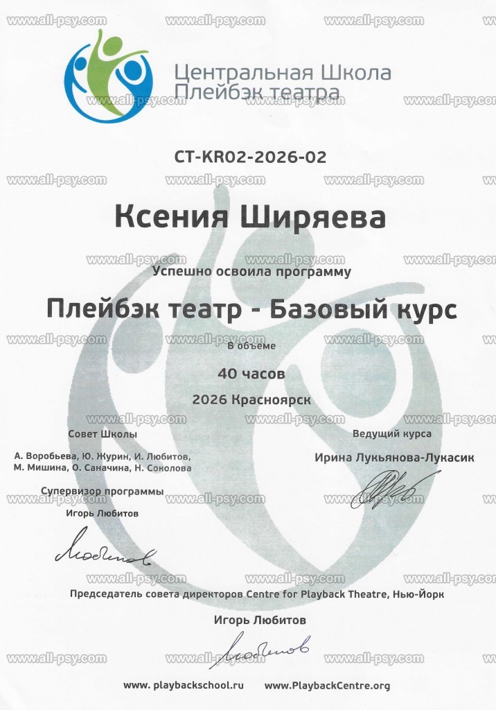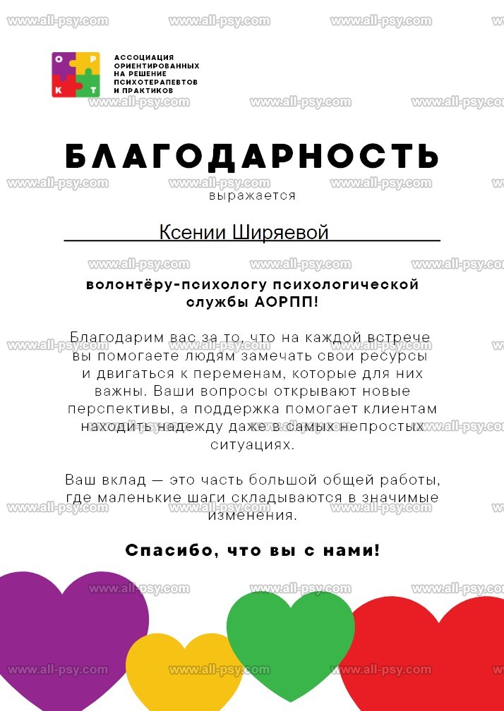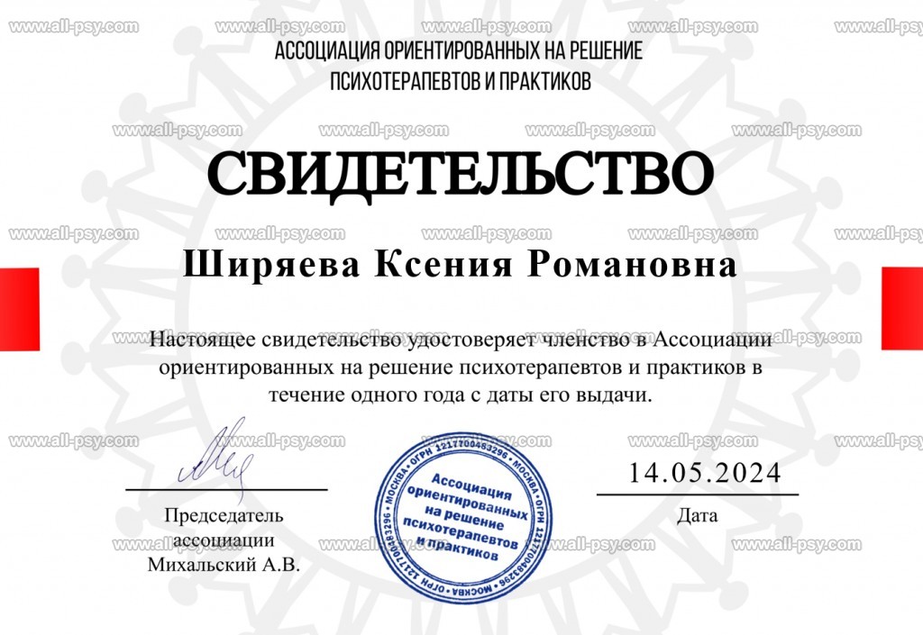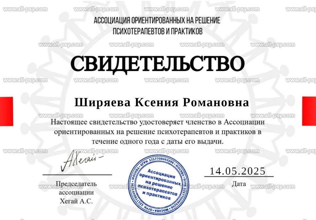 С 2024 г. являюсь членом Ассоциации ориентированных на решение психотерапевтов и практиков (АОРПП).