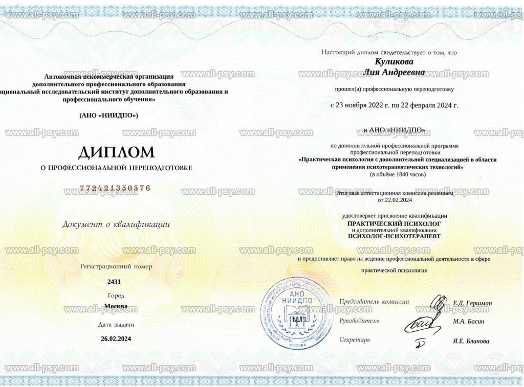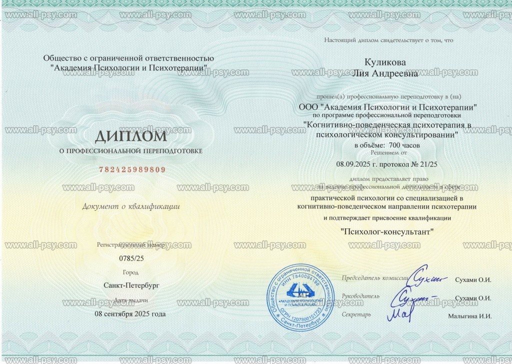 Добрый день! Я практикующий психолог, и моя работа — это создание пространства, где вы можете быть собой, исследовать свой внутренний мир и находить ресурсы для качественных изменений в жизни.