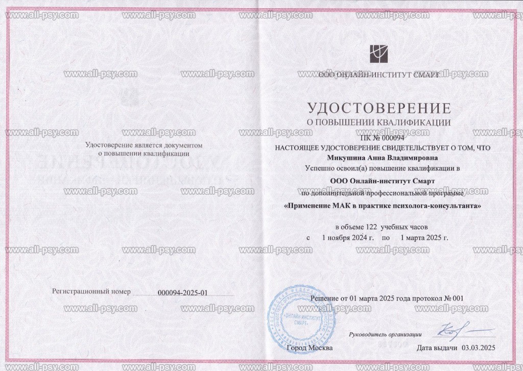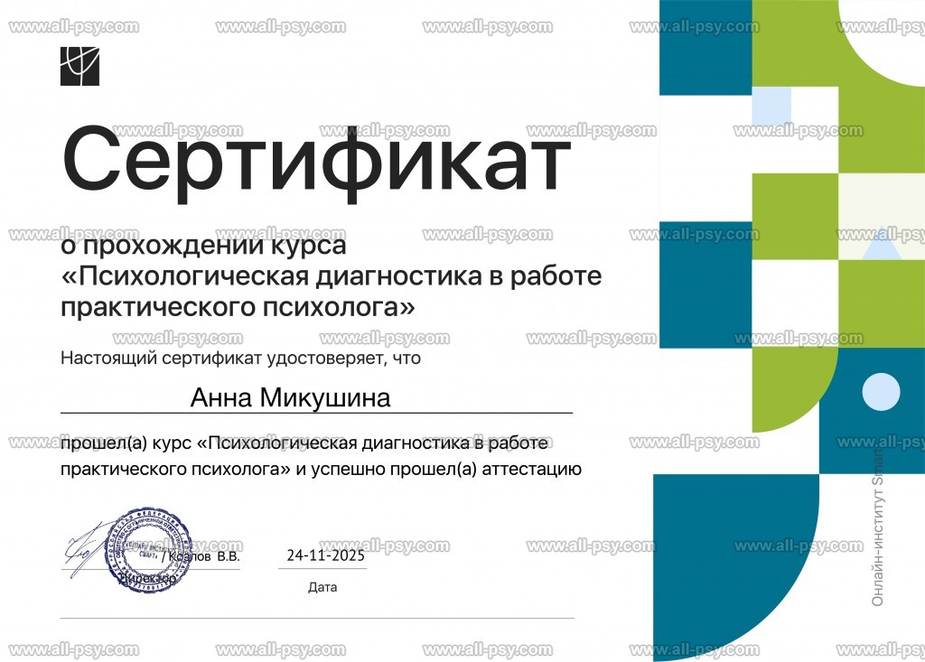 Я Анна — психолог и когнитивно-поведенческий терапевт. Имею высшее психологическое образование и работаю в когнитивно-поведенческом подходе. Окончила Алтайский Государственный Университет (направление психология) и Онлайн-институт Смарт (направление когнитивно-поведенческая терапия). Имею опыт работы на платформе SmartMental, более 70 часов супервизий по стандартам ОППЛ и более 80 часов личной терапии.