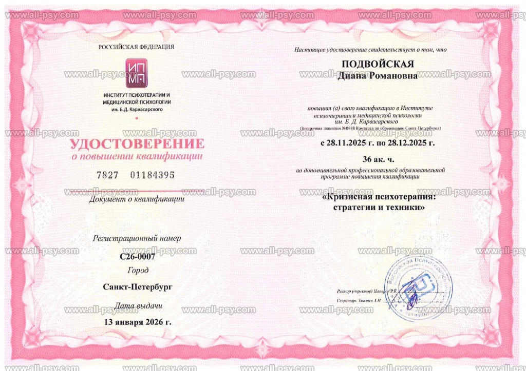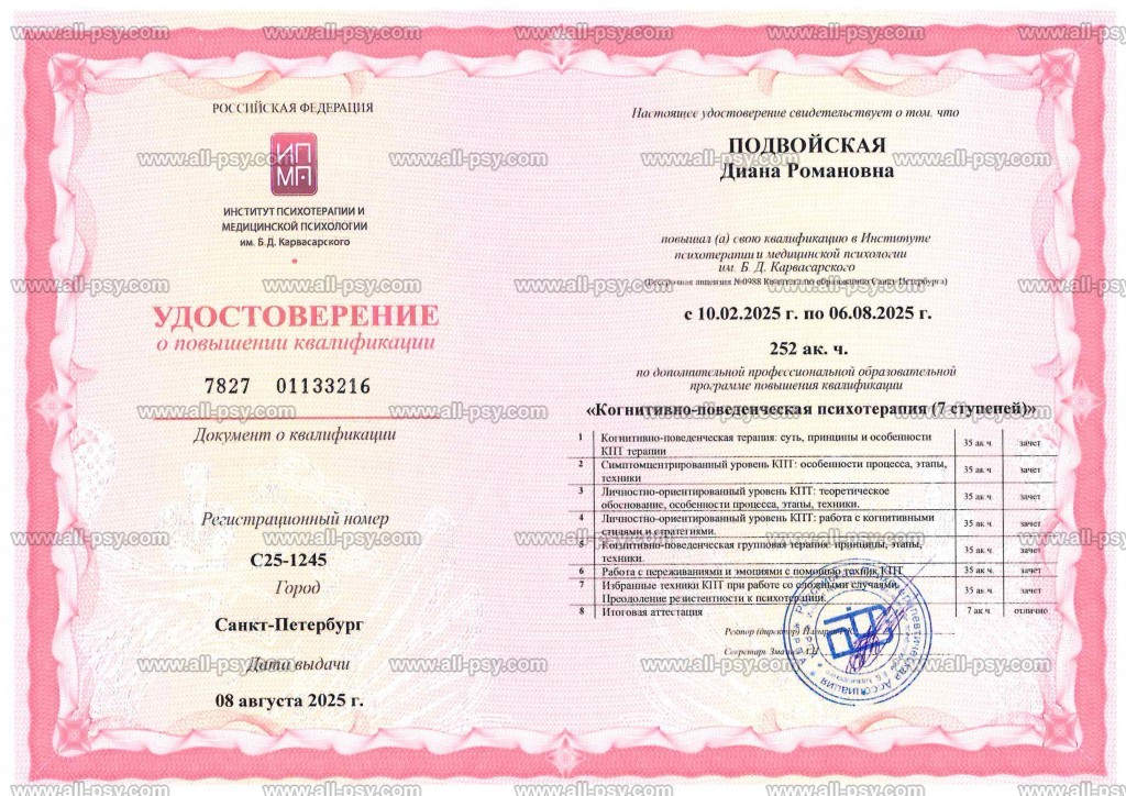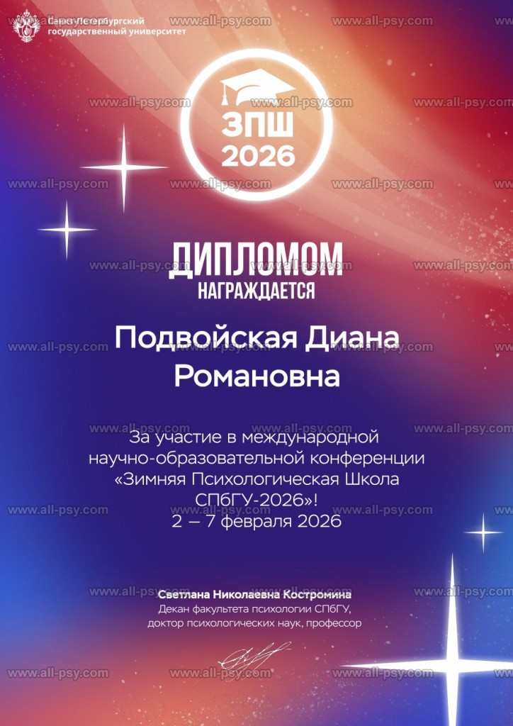 Меня зовут Диана, я психолог с профилем подготовки по клинической психологии, практикующий в рамках когнитивно-поведенческого подхода.