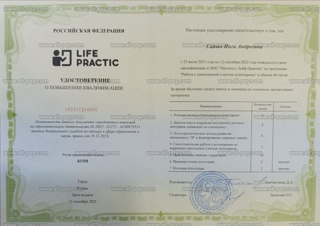 Здравствуйте, меня зовут Инга (Sayin), я – психолог. Специализации: гипноз; психосоматические заболевания, стрессовые расстройства; тревожные состояния; панические атаки (паническое расстройство); внутрисемейные и групповые конфликты; сложности в достижении результатов; заниженная самооценка. Имею сертификацию по «Арт-терапии».