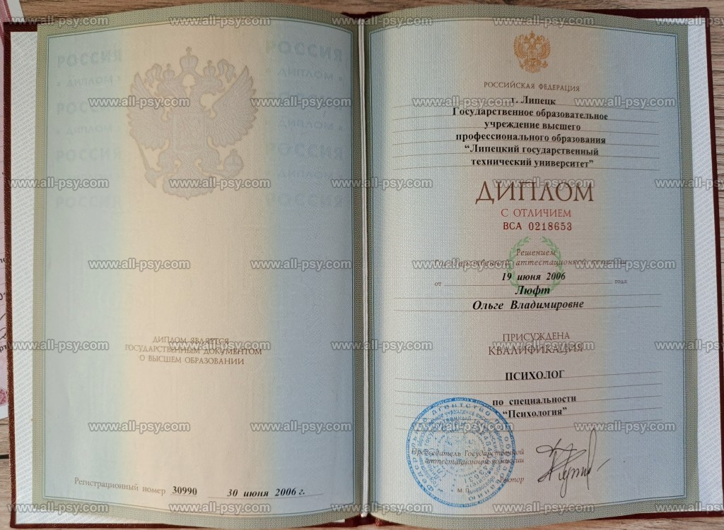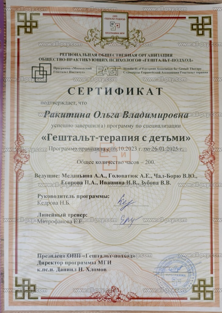 Сертифицирована как гештальт-терапевт по работе с детьми и подростками в рамках гештальт-терапии (специализация МГИ в г.Воронеж).