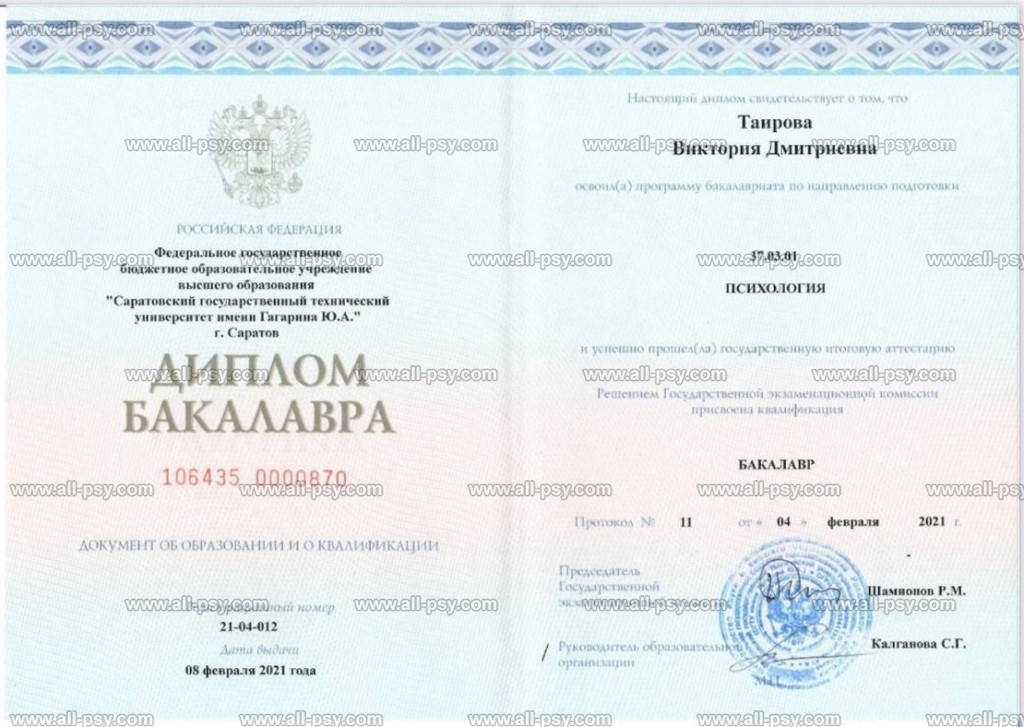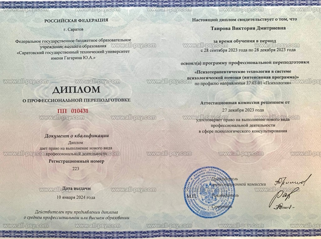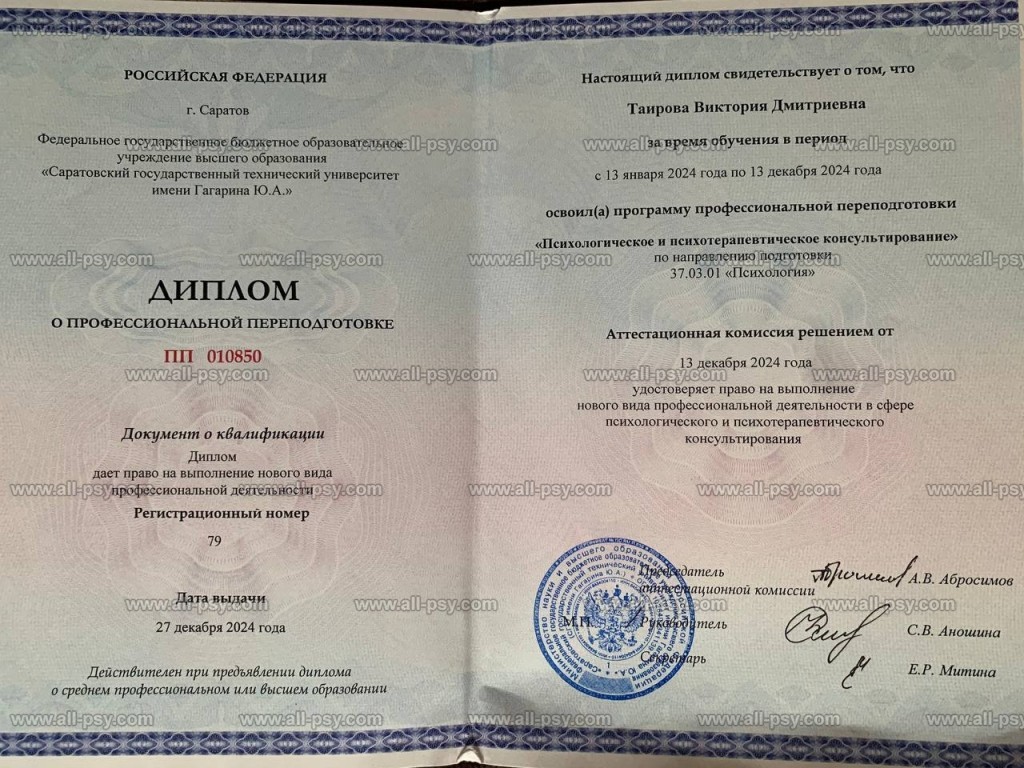У меня высшее психологическое образование (СГТУ им. Гагарина), регулярно прохожу профессиональные переподготовки и всегда нахожусь в процессе повышения квалификации, чтобы предлагать вам самые актуальные и эффективные методы помощи.