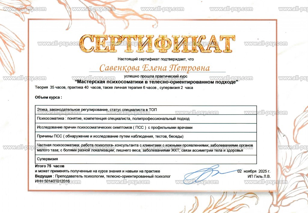 Моя специализация - психосоматика и телесно-ориентированная терапия. Ко мне можно прийти, если вы ощущаете, что тело посыпалось, походы по врачам не дают стойких результатов, а вы эмоционально истощены.