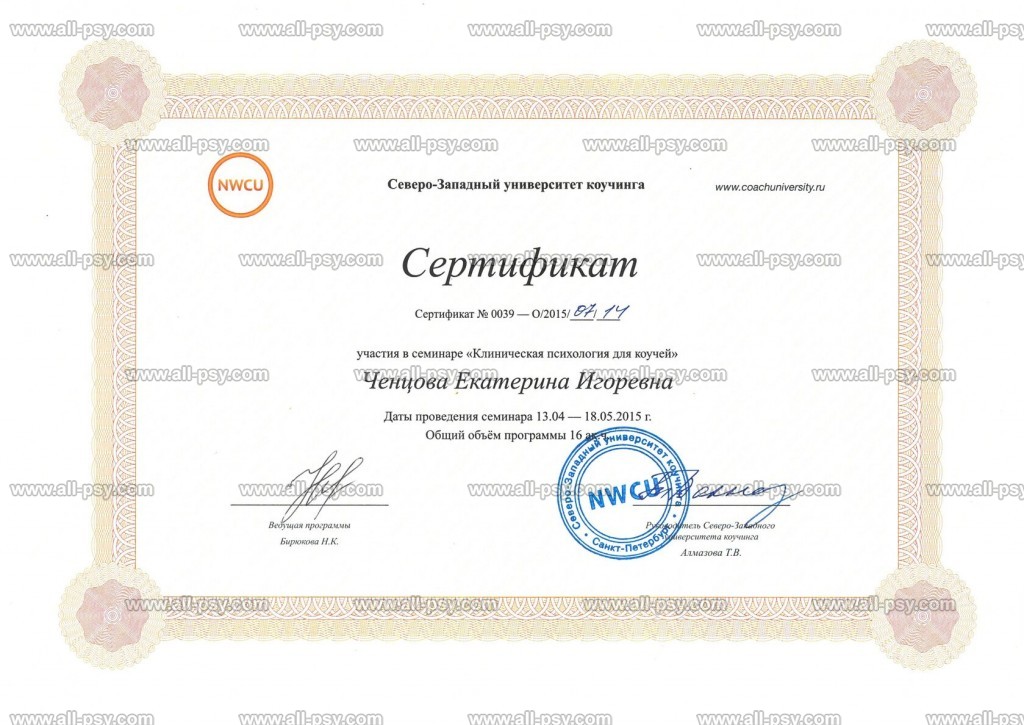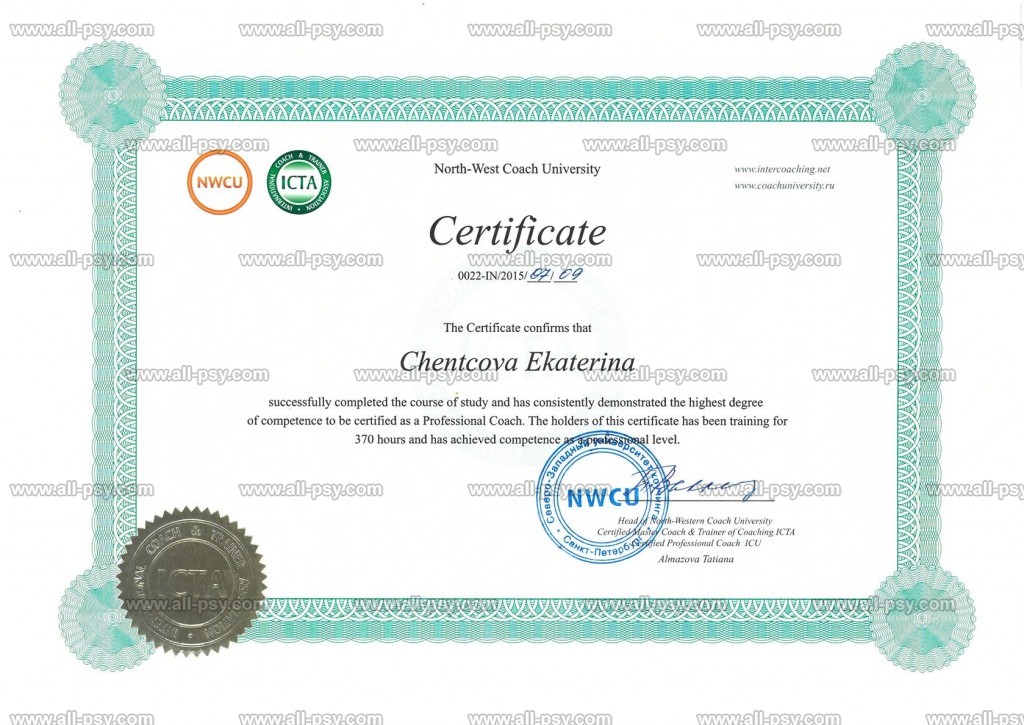 - Сертифицированный коуч, International Coach & Trainer Association, 2015 г.