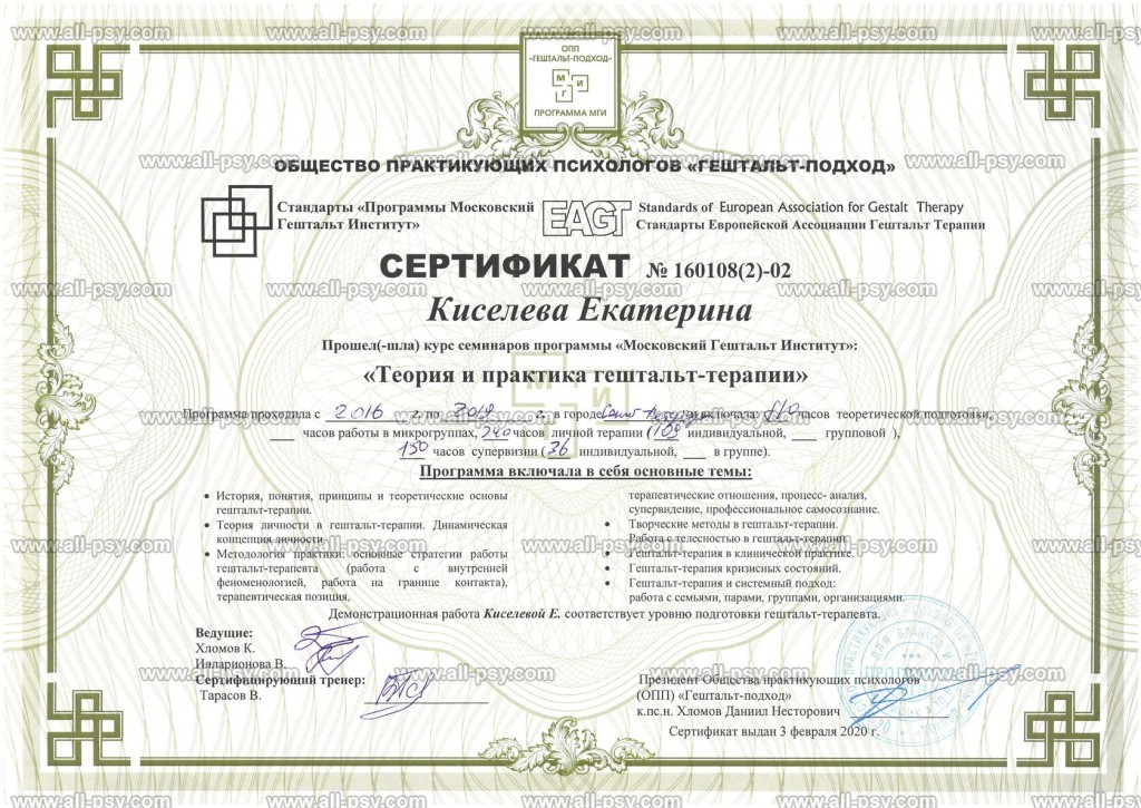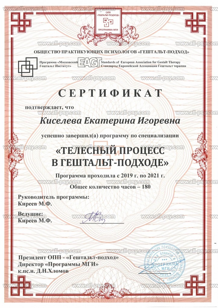 - Cертифицированный гештальт-терапевт, МГИ, 2020 г.