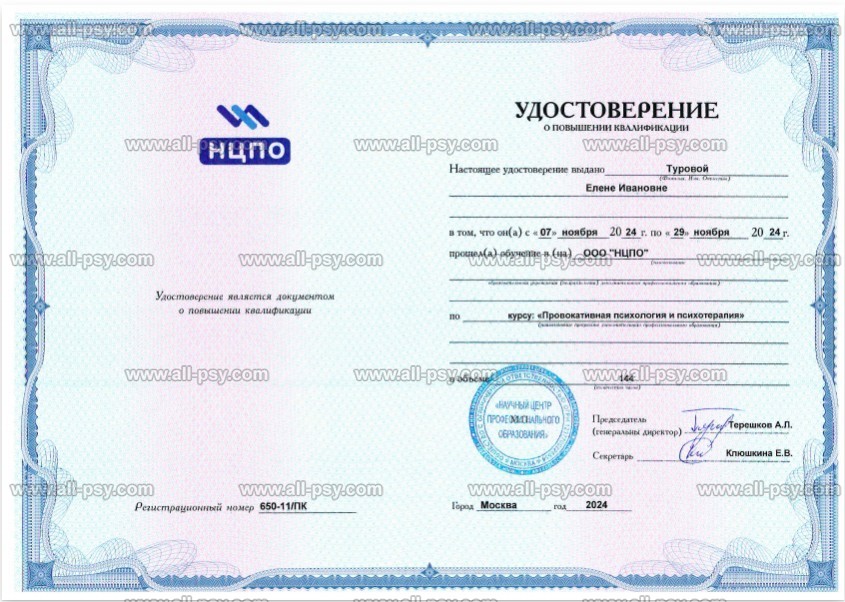 О психологии мечтала с 9 класса, но возможность учиться появилась только после 35 лет, видно так было угодно судьбе, чтобы иметь возможность понимать и помогать людям, надо было пережить и разводы, и зависимости, и др. испытания. Готова учиться и рабоать 24 часа в сутки. В своей работе использую методы гипнотерапии, энергетической психологии, аудиовизуальную стимуляцию головного мозга (mindmachine), телесно-ориентированную терапию, НЛП и др. Так же изучаю Рейки (мастер), мануальную терапию, методы народной медицины, т.к. считаю, что невозможно лечить душу, не помогая телу. Люблю выращивать цветы и дарить их, в свободное время шью, вяжу … Занимаюсь каратэ, имею 1 кю.