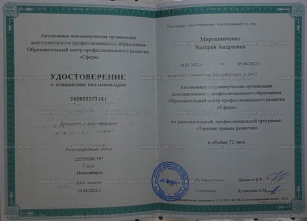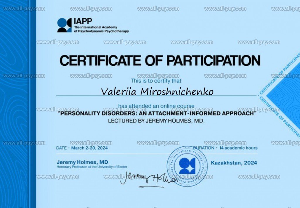 Одна из моих квалификаций и сфер профессиональных интересов — теория привязанности и терапия травмы привязанности. Ко мне приходят с тревогой в отношениях, созависимостью для избавления от неэффектифных поведенческих сценариев.