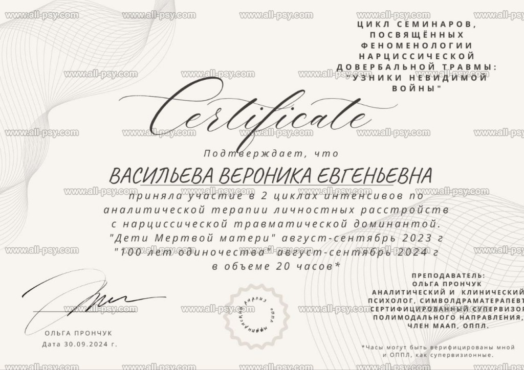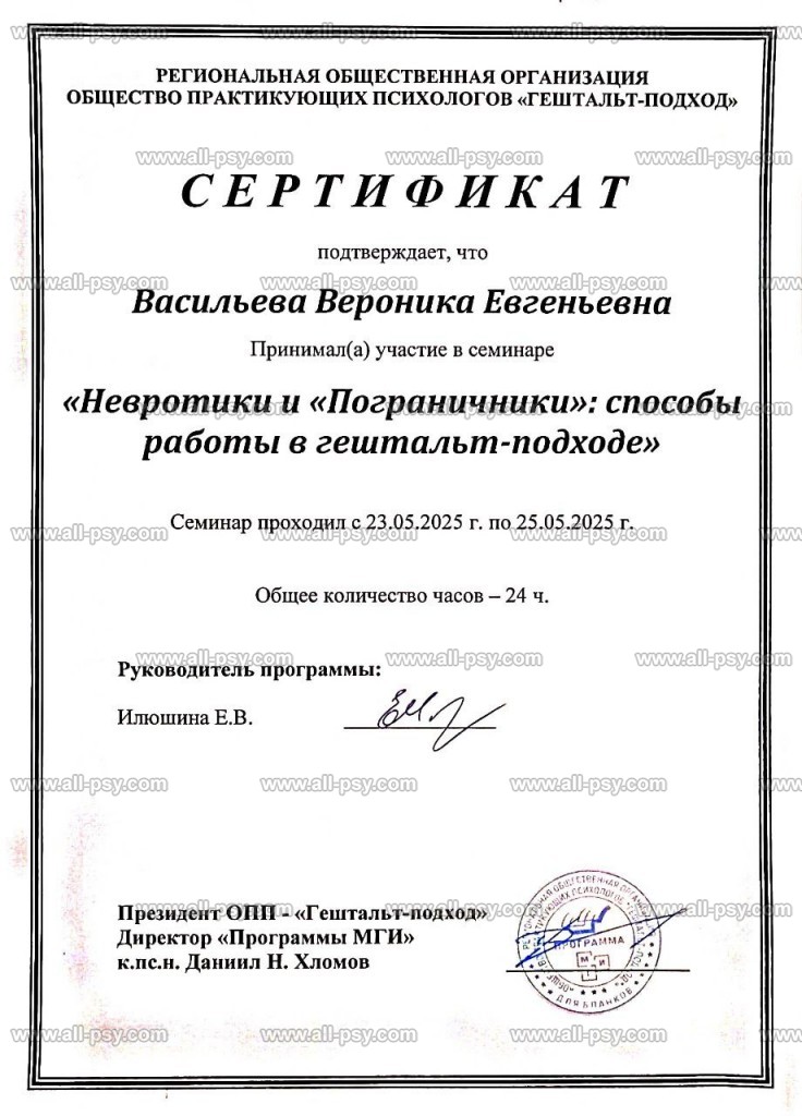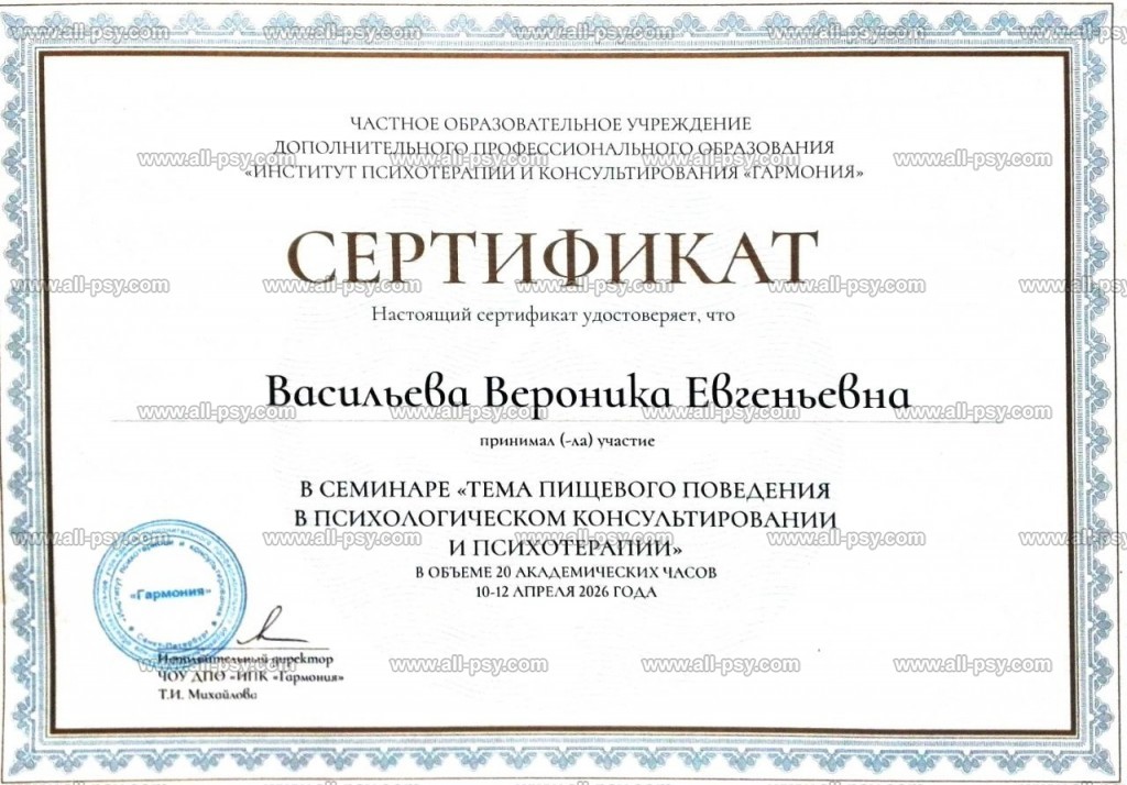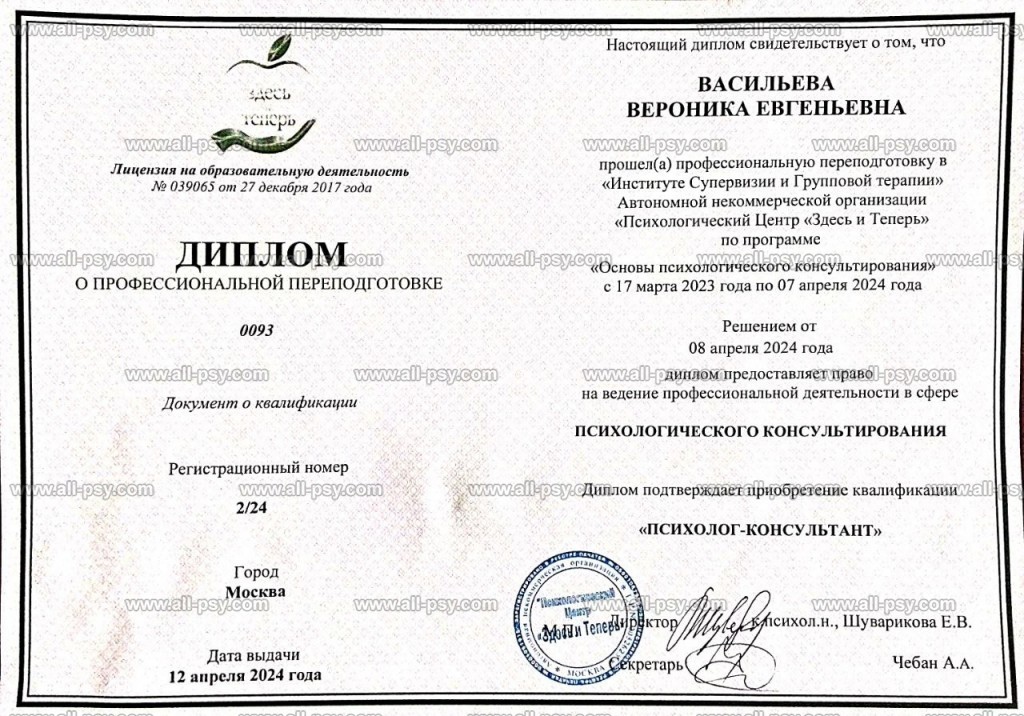 Я прошла профессиональную переподготовку по психологическому консультированию в Институте супервизии и групповой терапии. Сейчас продолжаю обучение в магистратуре по специальности Психология здоровья и в Международной школе психотерапии, консультирования и ведения групп института «Гармония».