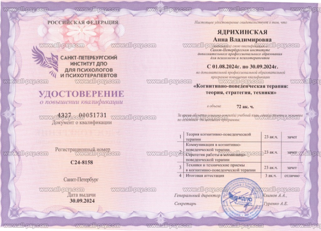Системная семейная терапия стала моей базой для понимания человека. При этом основное образование по клинической психологии позволяет вовремя заметить симптомы, это помогает предотвратить развитие серьёзных психологических проблем. Повышение квалификации в области когнитивно-поведенческой терапии даёт возможность эффективно работать с тревогами и убеждениями. Дополнительно я владею методами эриксоновского гипноза и генеративным коучингом, что расширяет возможности работы с внутренними ресурсами и бессознательным.