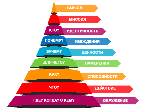 Это пирамида нейрологических (или логических) уровней (Р. Дилтс, модификация С.В. Ковалев). По этой пирамиде можно «двигаться», отвечая на вопросы как снизу вверх, так и сверху вниз.